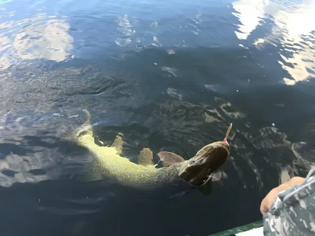 Сделав рядовой бросок спиннингом, я увидел спину щуки с эффектом дельфина, жадно бросившуюся за блесной, и тут же почувствовал удар. Думаю, села да села, сейчас мы ее немножко умотаем и покажем ей «коготь орла». (Это когда подводишь щуку к лодке и резко берешь руками за жаберные крышки, в этот момент она не дергается и ее без проблем можно извлечь из воды. Термин пришел в наш рыболовный словарный запас от Егора). Но не тут-то было, она и не думала сдаваться, это перетягивание шнура со щукой продолжалось минут семь. Я начинаю понимать, что рыба далеко не рядовая. Говорю Егору, чтобы был во всеоружии и готовился помогать. Рука начала сильно уставать. И что самое интересное, волнение в этот момент полностью отсутствовало, а истерика, наоборот, начиналась. Я не мог остановиться от хохота. Быстро взглянул на часы — борьба продолжалась уже 15 минут. Егор, бросив все, пристально наблюдая за мной, сидел и ждал поражения щуки в этой смертельной схватке. Мой смех не прекращался. Через 20 минут мы увидели эту рыбину. В воде она казалась килограммов на семь, но подтянув ближе к борту и втащив в лодку, поняли, что это самая большая щука из ныне пойманных нами. Она оказалось реально здоровенной, я не мог поверить своим глазам и рыбацкому счастью. Безмен был под рукой: контрольный замер «крокодила»… и ура, товарищи, победа налицо — 9 килограммов.