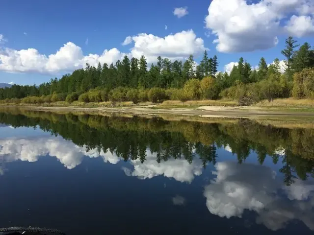 Прошли километров 40, характер реки стал меняться, пейзажи были просто нереальными, а мозг не воспринимал то, что видят глаза. Небесное полотно с сияющим солнцем, дремучий лес, отражающийся в зеркальной глади воды, величественные горы, желто-багряные берега и ни дуновения ветерка… Все это создавало атмосферу гармонии и полного умиротворения. Это было дыхание природы, наполняющее, как сосуд, самые далекие уголки твоей души, твоего сознания теплом и счастьем…