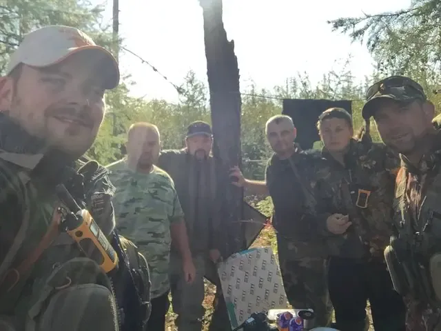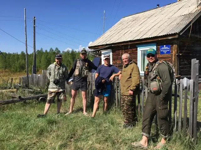 Дошли до назначенной точки, нас лаем встретили две лайки! Вдалеке виднелись деревянные домики с большими спутниковыми антеннами и солнечными батареями! Подойдя к домам в сопровождении четвероногих, несколько раз покричали хозяев. Тишина. Еще раз. Опять тишина. Подбежала еще одна собака, и все трое «обматерили» нас с головы до ног. Ждем. Наконец у одного из домиков открылась дверь, на крыльцо вышел мужчина лет 50, одетый в желтую клещевку и штаны цвета хаки, за ним женщина его же годов.