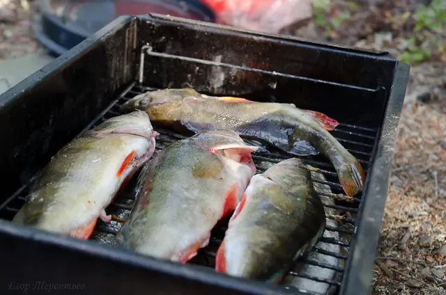 Новая стоянка была просто шикарной. Река в этом месте имела изгиб под 90 градусов и была шире, чем обычно, а ее глубина составляла метров девять. Это говорило о том, что здесь водятся «крокодильчики» нужных нам размеров. Не успев разгрузить лодки, Егор и Алексей взялись за спиннинги, сначала кидали в разные стороны, вытаскивая здоровенных окуней, а потом начали таскать их в отвес с лодки один за другим. Ни одного холостого заброса! В этот момент у Егора случился приступ истерического смеха, он ржал без остановки, пока это «безобразие» не закончилось.