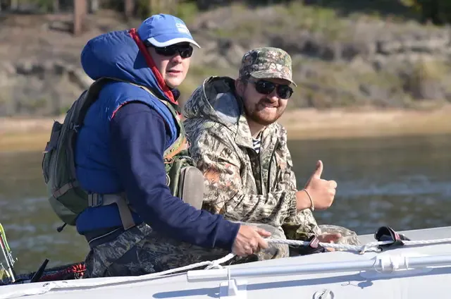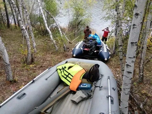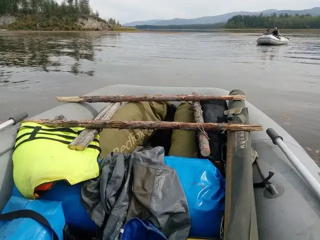 После загрузки лодок еще примерно два часа ушло на урегулирование веса в них. В итоге отрабатываем старую схему: решаем грузить «Ротан» по полной. В результате экипаж Николая и Владислава становится автоматически обреченным на водоизмещение и 4 часа, или 40 км, пути до первого транзита. Главное, успеть до темноты. Запас времени еще есть. Чтобы вывести наш с Алексеем «Солар-450» в глиссер, мне пришлось сидеть на самом носу лодки, свесив ноги. Иначе никак. Благо, вейдерсы имелись в наличии.