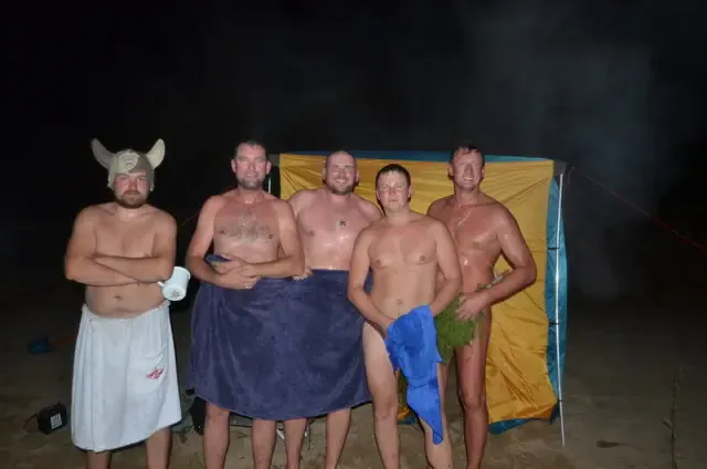 Представьте картинку: шестеро взрослых мужиков в одних труселях на одной лодке, да еще с фонариками, а лодка к вечеру уже приспускала… В общем, чувствовали себя в ней, как Мазай и зайцы. Если бы в темноте можно было резко включить большой прожектор и направить на нас… О да, это бы выглядело очень смешно. Запах таежных веников придавал большей экзотики нашей походной бане.