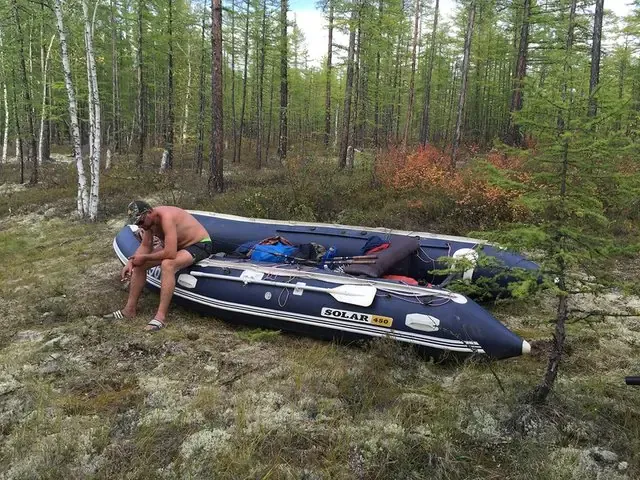 Резиновые лодки в лесу смотрелись очень смешно. Особенно веселила картина: стоит «Солар», на борту сидит Алексей, склонив голову, и курит; вид у него очень печальный и уставший, складывается впечатление, что человек отчаянно ждет большого прилива.