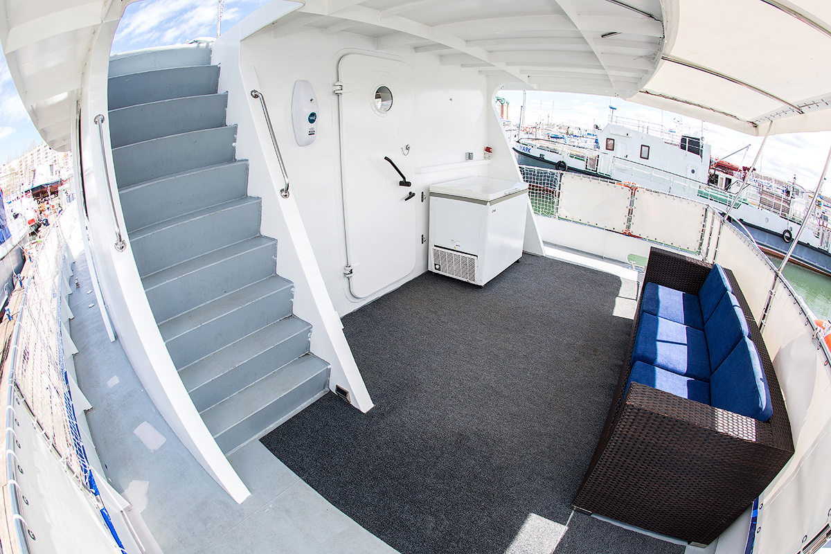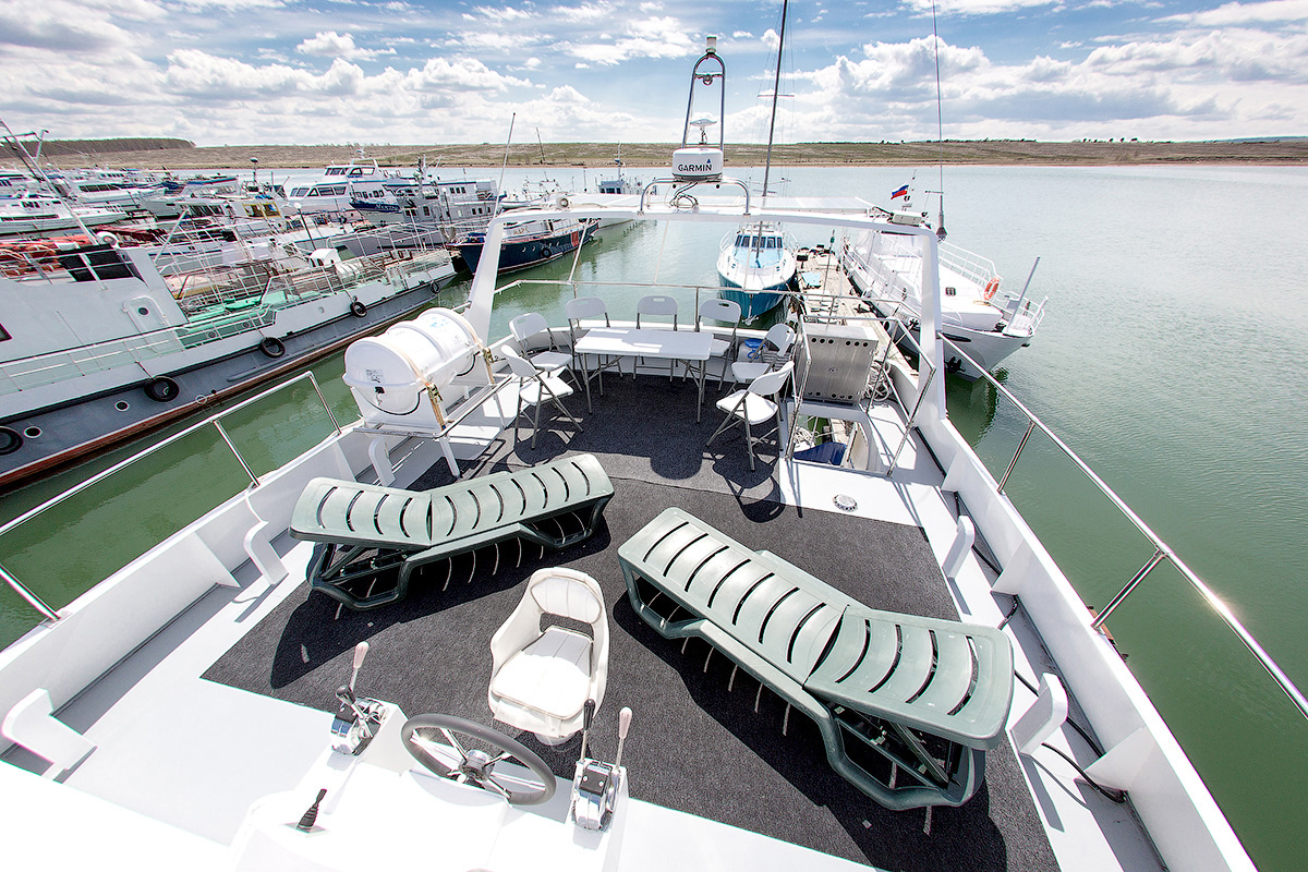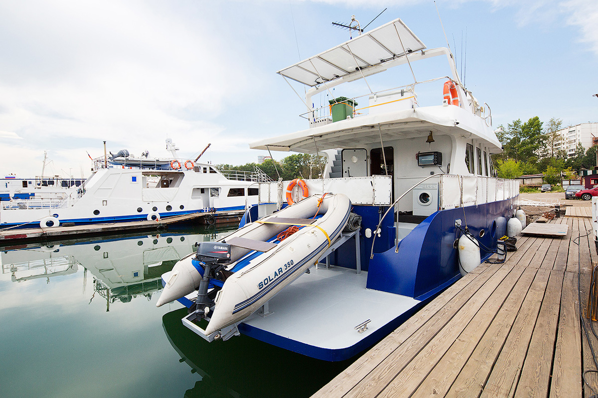 Это премиальное судно, одобренное Российским Речным Регистром и обладающее лицензией на перевозку пассажиров, обеспечит незабываемое путешествие для компании до 10 человек. Яхта длиной 19 метров и шириной 5,8 метра с осадкой по корме 1,4 метра, отличается широким корпусом, почти вдвое превосходящим габариты стандартных судов на Байкале.