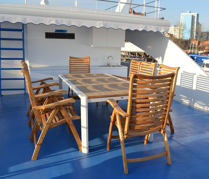 - на палубе находятся две зоны отдыха, стол и раскладные стулья для обедов на свежем воздухе.